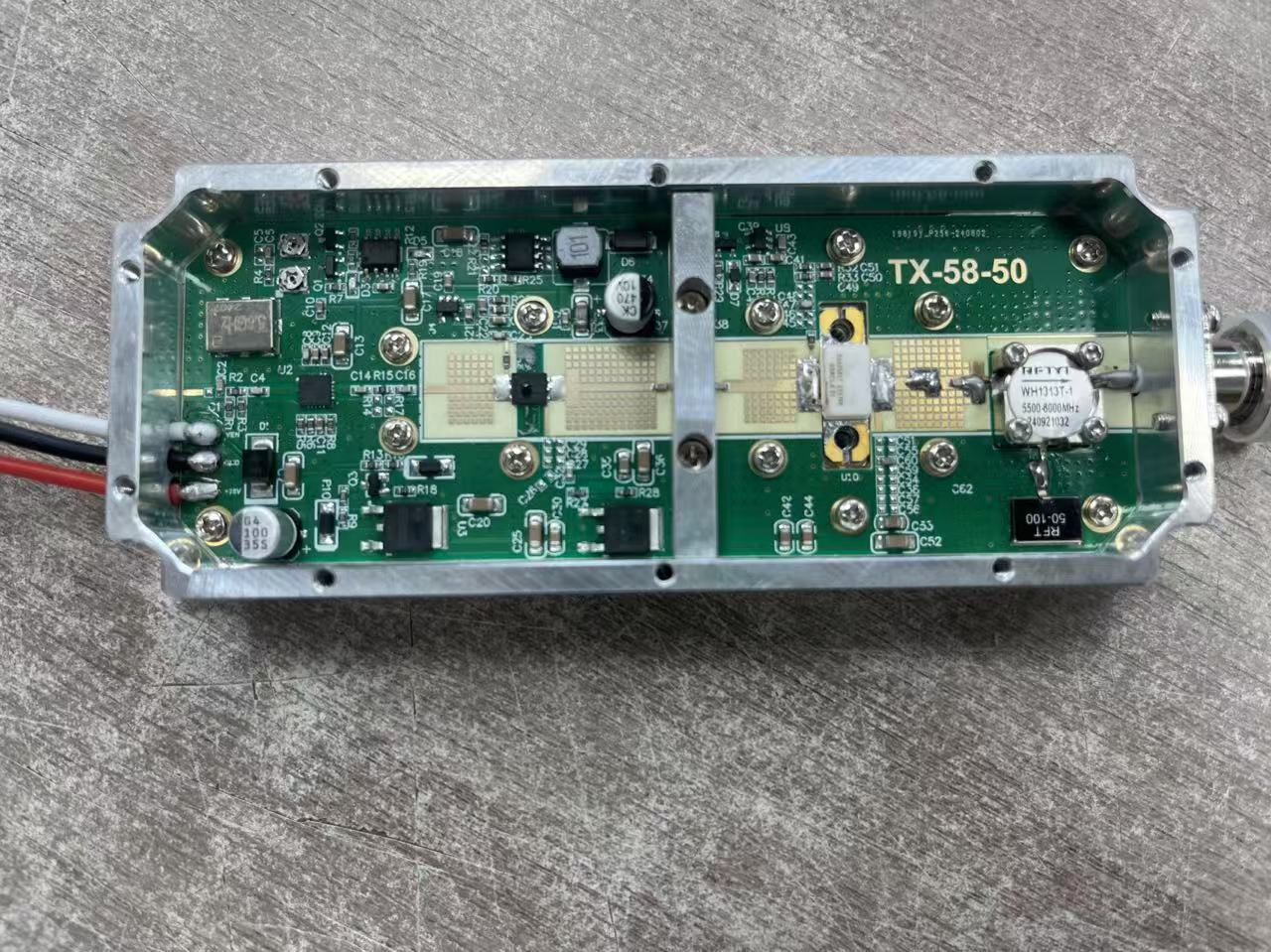 Αυτή η μονάδα RF υψηλής συχνότητας 5GHz GaN, 50W ασύρματης παρεμβολής κατά drone μπορεί να εκπέμπει σταθερά ισχύ στα 28V και είναι αποτελεσματική έναντι του 90% ή περισσότερο των drones στην αγορά. Βασικό του χαρακτηριστικό είναι ένας ενσωματωμένος κυκλοφορητής, ο οποίος μειώνει τις απώλειες που σχετίζονται με τη θερμότητα κατά τη λειτουργία σε υψηλή θερμοκρασία, βελτιώνοντας την ανθεκτικότητα της μονάδας. Το προϊόν κατασκευάζεται από το εργοστάσιο Texin, με χάραξη λέιζερ. Η συχνότητα και η ισχύς μπορούν να προσαρμοστούν στις απαιτήσεις του πελάτη.